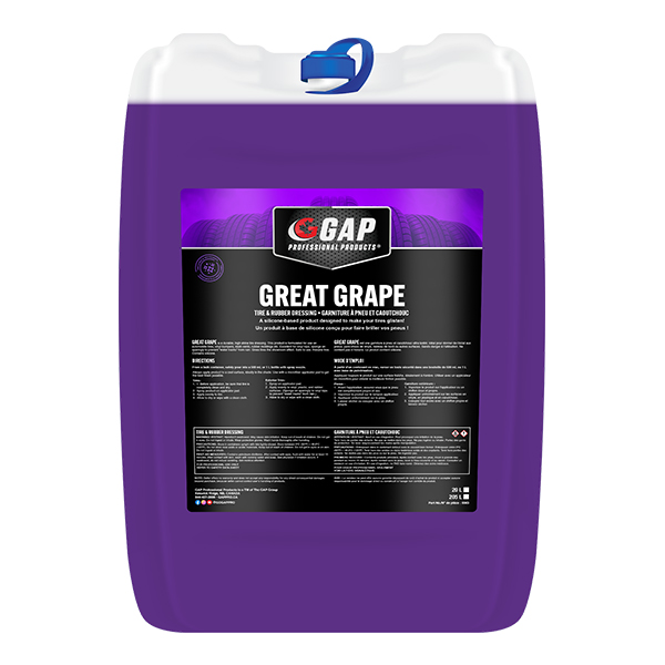 GREAT GRAPE is a durable, high shine tire dressing. This product is formulated for use on automobile tires, vinyl bumpers, dash vents, rubber moldings etc. Excellent for vinyl tops, sponge on sparingly to prevent “water tracks” from rain. Gives tires the showroom effect. Safe to use. Hexane free. Contains silicone.