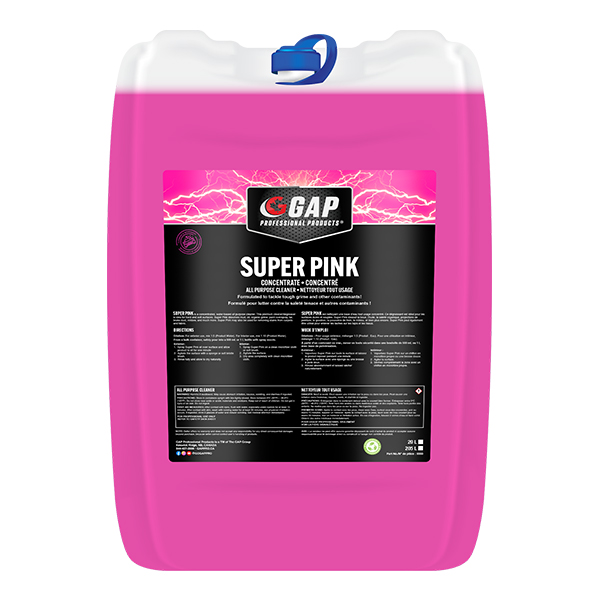 SUPER PINK is a concentrated, water-based all purpose cleaner. This premium cleaner/degreaser is idea for hard and soft surfaces. Super Pink dissolves mud, oil, organic grime, paint overspray, tar, brake dust, mildew, and much more. Super Pink may also be used for removing stains from carpets and fabric.