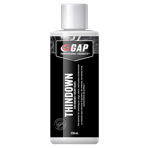 THINDOWN is specially formulated to remove tar, overspray, bugs, stains, and light surface contaminants. It is also the final step in the Road Rash Repair Process. For mixing and application instructions, refer to the Road Rash Repair instructions.